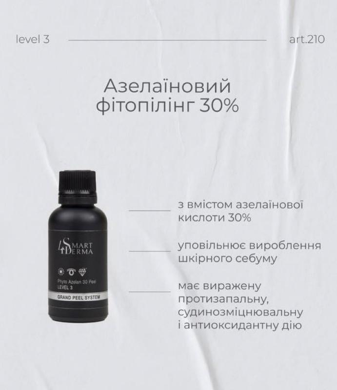 Модифицированный фито-пилинг с содержанием азелаиновой кислоты 30% оказывает выраженное противовоспалительное, сосудоукрепляющее и антиоксидантное действие; угнетает активность 5-альфа-редуктазы; замедляет выработку кожного себума; оказывает комедонолитическое действие; способствует уменьшению гиперпигментации. Удаляет отмершие клетки, очищает кожу, контролирует гиперкератоз, проявляет выраженные антибактериальные свойства, ингибирует тирозиназу, выравнивает цвет кожи. Не вызывает резистентности микроорганизмов к поверхности кожи. Показания: • расширенные поры, черные точки • акне 1-3 ступень • жирная кожа • постакнет, неглубокие рубцы и шрамы • мелкие морщинки • гиперкератоз • интенсивная себорегуляция • профилактика появления акне и комедонов • нормализация выделения шрирного себума • демодекс, розацеа, купероз (по протоколу) • пигментация • дерматит себорейного типа Достоинства: • Линия препаратов для поддержания толщины рогового слоя и обновление клеток дермоэпидермального слоя • Высокая проникающая способность • Не требуют предпилинговой подготовки • Обладают низким раздражающим потенциалом при максимальной эффективности. • Обеспечивают постепенное, непрерывное и равномерное проникновение препарата • Отличаются высокой химической устойчивостью формул