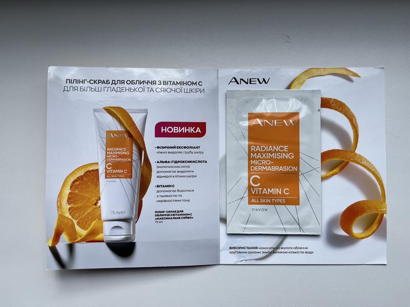 Пилинг-скраб для лица с витамином С «Максимальное сияние» – открытка с пробным образцом, 2мл. Микродермабразия у тебя дома как после визита в косметический салон с новым пилинг-скрабом для лица с витамином С «Максимальное сияние» Микродермабразия – это косметологическая процедура, цель которой состоит в удалении верхнего слоя кожи, его обновлении, уменьшении видимости морщин и выравнивании тона кожи. Теперь ты можешь получить результат, аналогичный профессиональной косметологии у себя дома! Достоинства: • ФИЗИЧЕСКИЙ ЭКСФОЛИАНТ (скраб) мягко и осторожно снимает ороговевшие частицы кожи, работает как альтернатива профессиональному лечению микродермабразией. • отшелушивающие кислоты AHA и вспомогательные молочные кислоты удаляют мертвые клетки кожи. Как результат – чистая и обновленная кожа блика. • витамин С в составе восстанавливает и придает сияющий вид, помогает бороться с серым цветом и выравнивает тон. Пилинг-скраб для лица с витамином С «Максимальное сияние» от Avon – идеальная альтернатива лечению кожи методом микродермабразии. Заметно гладкая, сияющая с виду кожа сразу после первого применения! Применение: Нанести легкими массирующими движениями на влажную кожу лица, избегая области вокруг глаз. Затем смыть теплой водой. Использовать 3 раза в неделю. Для использования в качестве маски оставить на 5 минут перед тем, как смыть. Для достижения наилучших результатов используйте сыворотку для лица с витамином С "Максимальное сияние" Anew.