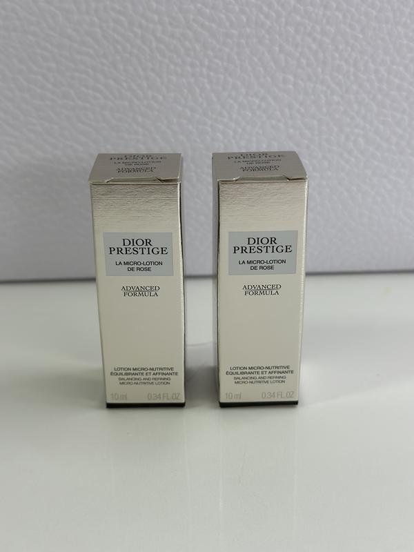 Мініатюра 10 мл, преміальної серія Особливості Dior Prestige La Micro-Lotion de Rose Advanced Formula: - проявляє зміцнювальні й захисні властивості; - покращує екосистему шкірного покриву, відновлює його баланс; - забезпечує до 48 годин глибокого зволоження; - відновлює пружність, розгладжує зморшки; - покращує рівномірність тону; - чинить антиоксидантну ді; - запобігає наслідкам від впливу стресу й стар