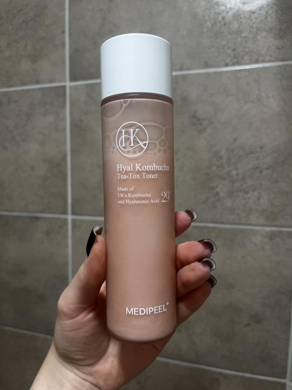 Залишок на фото , строки в нормі Користувалась не торкаючись обличчя Бренд: Medi-Peel Серія: face care Група товару: тонер для обличчя Призначення: відновлення, заспокоєння, зволоження, розгладження Об'єм: 150ml Інгредієнти: баобаб, білий чай, вітамін e, вітаміни групи в, гліцерин, гіалуронова кислота, диня, дріжджі, жасмин, керамiди, магній, мандарин, ніацинамід, олива, пептиди, персик, рис, сечовина, троянда, центелла Формула засобу: водна, делікатна, з гліцерином Час застосування: універсальний Стать: для жінок Класифікація: професійна Тип шкіри: всі типи Країна ТМ: Корея Зроблено в: Корея 70% чайного гриба і 30% керамідів — ось ефективна формула для розв'язання різних проблем шкіри, від сухості та втомленого вигляду до втрати пружності. Тонер для підвищення еластичності шкіри обличчя з комбучею і гіалуроновою кислотою миттєво відновлює гідробаланс, стимулює вироблення колагену, а також освітлює нерівності тону. Завдяки зміцненню ліпідного бар'єру, ви отримуєте додатковий захист від вітру, холоду і навіть міських забруднень. Загалом тонер від корейського бренда MEDIPEEL позитивно впливає на загальний стан шкіри, звужуючи пори, розгладжуючи лінії та підвищуючи її тонус. Особливості MEDIPEEL Hyal Kombucha Tea-Tox Toner: - екстракт камелії загоює пошкодження епідермісу, а також збільшує вироблення колагену й еластину; - аденозин сприяє виробленню колагену й еластину, зменшує зморшки та створює підтягувальний ефект; - екстракт чайного гриба скорочує пори, освітлює пігментні плями, надає шкірі пом'якшеності та гладкості; - екстракт баобаба захищає від вільних радикалів, знижує шкідливий вплив ультрафіолетових променів; - кераміди запобігають зневодненню, зміцнюють природний захисний бар'єр; - гіалуронова кислота допомагає утримувати вологу, покращує текстуру шкіри; - ніацинамід усуває жирний блиск і тьмяний відтінок, вирівнює тон.