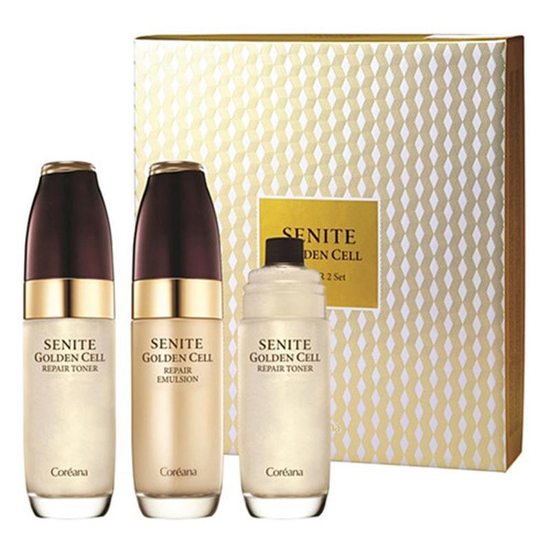 Набор для ухода за кожей лица с экстрактом стволовых клеток аукубы и нанокластеров золотого порошка Набор состоит из: Senite Golden Cell RepairToner/Тонер 150 ml + 150 ml Senite Golden Cell Repair Emulsion/Эмульсия 150 ml в подарочной коробке Серия Coreana Senite Golden Cell Repair основана на экстракте стволовых клеток аукубы и нанокластеров золотого порошка. В растительных стволовых клетках аукубы содержится большой потенциал, содействующий активному обновлению клеточной ткани эпидермиса. Производитель Coreana не зря остановился на применении именно стволовых клеток аукубы, у них есть целый ряд достоинств: - Содержатся полезные для кожи человека вещества - антиоксиданты, белки, аминокислоты. Их эффективность и повышение активности в человеческой клеточной ткани доказана разными исследованиями. Они положительно действуют на дерму и запускают глубинные процессы обновления. - В материале нет пестицидов, тяжелых металлов, токсинов, которые могут содержать обычные растительные экстракты. - Сырье производится в стерильных лабораторных условиях, где тщательно контролируется качество заданных стандартов. Клеточная масса быстро растет и делится, поэтому компоненты доступны круглый год. - Это экологическое сырье, которое производится без нанесения вреда окружающей среде, с высокой степенью очистки. Благодаря активному действию стволовых клеток: - Улучшается цвет лица - тон становится более ровным, лицо выглядит свежим и отдохнувшим. - Сокращается глубина и количество мелких морщинок. Фитостволовые клетки обладают мощными антиоксидантными свойствами. В результате регулярного применения косметических средств с их содержанием состояние кожи заметно улучшается, она выглядит моложе. - Восстанавливается эластичность и упругость кожных покровов, овал лица подтягивается, уменьшается дряблость кожи. Причина в том, что растительные стволовые клетки ускоряют естественную выработку коллагена и эластина в тканях. - На клеточном уровне улучшаются процессы метаболизма. Растительные вещества взаимодействуют с рецепторами кожи, ускоряя обмен веществ, что обеспечивает эффект лифтинга. - Восстанавливаются поврежденные компоненты кожи, в результате чего она омолаживается и приобретает здоровый вид. Производитель обещает эффект самообновления кожных покровов, возвращение им энергии юности. Однако не стоит надеяться, что их использование повернет время вспять и на 100 % улучшит состояние кожи до показателей молодости. В состав косметических средств Coreana Senite Golden Cell Repair также входят масло арганы и экстракт фасоли. Масло арганы «сцепляется» с клетками поверхностного слоя эпидермиса и оказывает мгновенный увлажняющий, противовоспалительный и питательный эффект, поддерживая водно-жировой баланс. Экстракт фасоли способствует уменьшению дряблости кожи, хорошо подходит для воспаленной и раздраженной кожи. Наночастицы золота творят чудеса с увядающей кожей -- насыщают ее клетки кислородом и улучшают метаболизм, способствуют усвоению других полезных компонентов, очищают от токсинов, нормализуют Ph-баланс, увлажняют и омолаживают. *Законом не предусмотрено возврат и обмен данного товара.