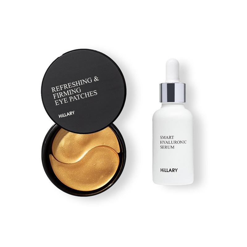 Завдяки освіжаючим гідрогелевим патчам набряклі очі миттєво стають відпочилими та сяючими. Продукт, збагачений вітаміном C та ретинолом, помітно освітлює темні кола під очима. Екстракт петрушки чинить м'яку протинабрякову дію та ефективно зменшує пігментацію. Екстракт кори шовковиці зміцнює стінки капілярів та стимулює синтез колагену. Гіалуронова кислота та колаген зменшують прояви мімічних та "сонних" зморшок, роблячи шкіру гладкою та пружною. Підходять для всіх типів шкіри. А гіалуронова сироватка зволожує глибокі шари шкіри, попереджає старіння і відроджує молодість шкіри, відновлює і захищає, утримує вологу всередині шкіри, помітно скорочує зморшки, підтягує шкіру і надає їй сяйва. Під час масажу, властивості гіалуронової сироватки значно підсилюються. До набору входять: - Освіжаючі зміцнювальні патчі з вітаміном C Hillary Vitamin C Refreshing & Firming Eye Patches, 60 шт; - Гіалуронова сироватка Hillary Smart Hyaluronic, 30 мл. Спосіб застосування: 1. Нанесіть масажними рухами невелику кількість сироватки на чисту шкіру обличчя, шию і зону декольте. 2. Наносьте гідрогелеві патчі на чисту суху шкіру під очима на 15-20 хвилин вранці, увечері або за потреби. Можна наносити також на носогубні складки, лоб або шию. Викиньте патчі після використання і розподіліть сироватку, що залишилася, по шкірі, легко вбиваючи пальцями.