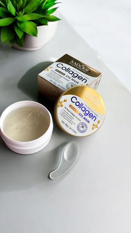Омолоджувальні патчі для повік Sadoer Collagen з 10-кратним вмістом колагену — це ефективний засіб для догляду за шкірою навколо очей. Активний колаген інтенсивно зміцнює і відновлює шкіру навколо очей, зменшуючи видимість зморщок і повертаючи пружність. Патчі мають мультиефект, забезпечуючи комплексний догляд за чутливою до вікових змін шкірою повік. Переваги гідрогелевих антивікових патчів Sadoer Collagen Anti-Aging Eye Mask: багатофункціональний ефект: зміцнюють і відновлюють шкіру; зміннішети нагорілки навколо очей; освітлюють темні кола під очима; живлять і зволожують тонку шкіру повік; згладжують зморшки, роблячи шкіру гладкішою та молодшою. Ідеально підходять для омолодження й догляду за шкірою навколо очей, роблять її свіжою та сяйливою.