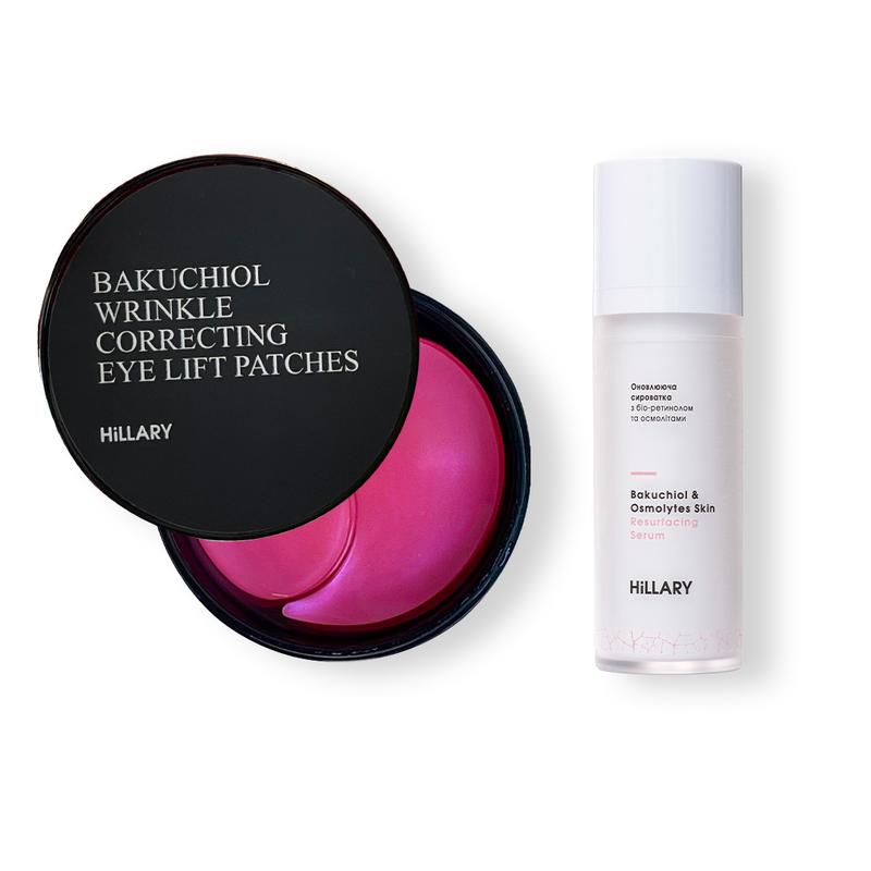 Сироватка з рослинним аналогом ретинолу - бакучіолом + Ефективні патчі під очі з рожевою водою та бакучіолом - ідеальна комбінація для покращення структури шкіри та надання обличчю сяйва, підвищення пружності та еластичності шкіри. Сироватка із бакучіолом бореться зі зморшками, зменшує гіперпігментацію і вирівнює тон. Усуває недосконалості шкіри, підсушує висипання, має анти-акне дію. Cироватка збагачена спеціальним комплексом осмолітів, які допомагають стимулювати зволоження на клітинному рівні та утримувати вологу всередині шкіри. Ідеально підійде для жирної, проблемної та комбінованої шкіри. А ефективні патчі під очі з рожевою водою та бакучіолом для синергічної дії: розгладження зморшок, освітлення шкіри та ліфтинг-ефект. Біо-ретинол (бакучіол) освітлює шкіру, значно зменшує виразність зморшок, роблячи шкірний покрив навколо очей щільним та еластичним. Гідрогелеві патчі насичені екстрактом дамаської троянди, яка забезпечує пружність, зволоження та сяйво шкіри. Ірландський мох у складі чинить потужну антиоксидантну дію, а гіалуронова кислота утримує вологу всередині шкіри, роблячи шкіру гладенькою та пружною. Підходять для всіх типів шкіри. До набору входять: - Розгладжувальні патчі з біо-ретинолом Hillary Bacuchiol Wrinkle Correcting & Eye Lift Patches, 60 шт - Оновлююча сироватка з біо-ретинолом та осмолітами Hillary Bakuchiol & Osmolytes Skin Resurfacing Serum, 30 мл Спосіб застосування: 1. Нанесіть на очищену шкіру тонким шаром, дати увібратися 10-15 хвилин. За необхідності нанести крем. 2. Наносьте гідрогелеві патчі на чисту суху шкіру під очима на 15-20 хвилин вранці, увечері або за потреби. Можна наносити також на носогубні складки, лоб або шию. Викиньте патчі після використання і розподіліть сироватку, що залишилася, по шкірі, легко вбиваючи пальцями.