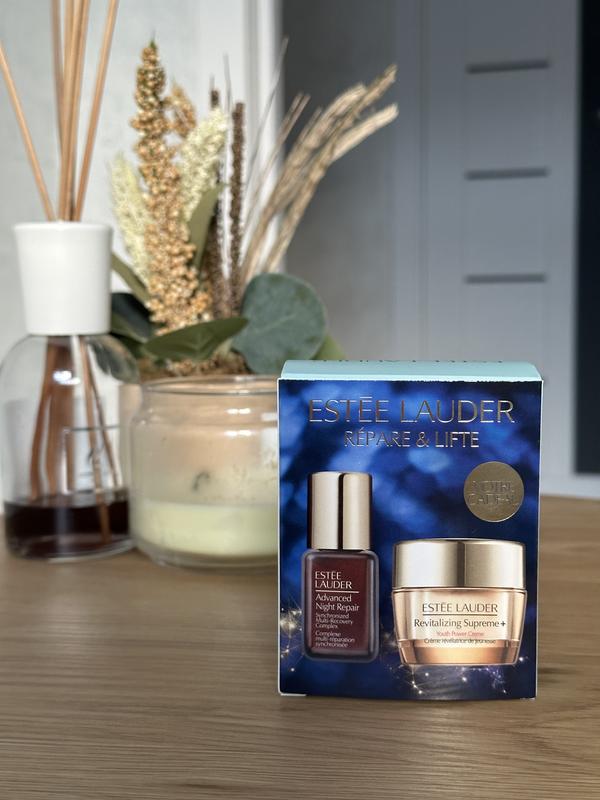 Красивая кожа начинается с этого мощного энергетического дуэта, который помогает уменьшить видимость линий и морщинок и возродить ваше сияние. Наша сыворотка Advanced Night Repair с эксклюзивной технологией помогает коже оптимизировать ее естественный ритм восстановления и защиты, чтобы обеспечить видимое обновление. При длительном применении значительно уменьшается количество признаков старения, вызванных влиянием окружающей среды современной жизни. Прокиньтесь с более молодой кожей. Revitalizing Supreme+ Creme значительно улучшает упругость, плотность и эластичность для более подтянутого вида. Уменьшает видимость линий и морщин. Кожа более прочная, сияющая, глубоко увлажненная. Обладает новой здоровой жизненной силой. СТВОРЮЄМО МАЙБУТНЄ КРАСИ РАЗОМ. Пожалуйста, утилизируйте эту коробку. Эта ограниченная коллекция путешествий включает: Advanced Night Repair Synchronized Multi-Recovery Complex, роскошный дорожный размер (7 мл) Revitalizing Supreme+ Youth Power Creme, роскошный дорожный размер (15 мл)