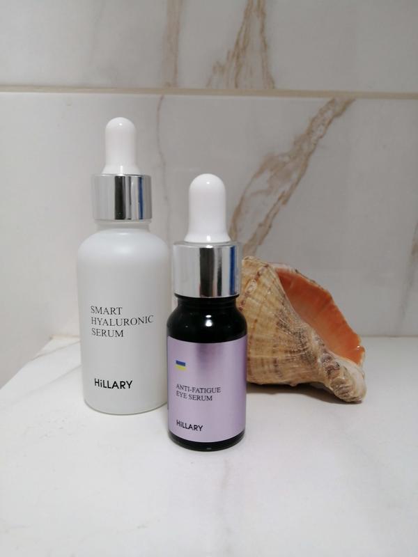 Сыворотка Smart увлажняет глубокие слои кожи и действует как противовоспалительный агент. Предупреждает старение и возрождает молодость кожи. А восстанавливающая сыворотка вокруг глаз обеспечивает лифтинг-эффект, замедляя процесс естественного старения эпидермиса в нежной зоне вокруг глаз. В состав сыворотки входит кофеин и экстракт зеленого чая, которые снимают отек и эффект усталости, синие пятна вокруг глаз. Способ применения: Hillary Smart Hyaluronic нанести массажными движениями небольшое количество сыворотки на чистую кожу лица, шею и зону декольте. Наносить сыворотку можно ежедневно, в том числе в качестве активного средства под дневной крем, а также вечером. Далее небольшое количество сыворотки Hillary Anti-fatigue нанесите кончиками пальцев на хорошо очищенную кожу вокруг глаз, один или два раза в день.