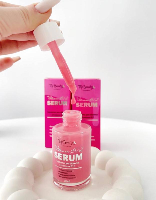 Сыворотка для лица с витамином В12 от Top beauty Предназначена для увлажнения, питания и защиты от вредных окружающих факторов. Активными компонентами сыворотки являются: Витамин В12 – поддерживает здоровье кожи, повышает ее эластичность, уменьшает сухость, шелушение и воспаление, также улучшает микроциркуляции. Экстракт черники – осветляет пигментные пятна, предупреждает появление морщин, питает и насыщает витаминами, выравнивает тон кожи, поддерживает ее тургор. Ниацинамид - стимулирует синтез естественного коллагена кожи, имеет ряд противовоспалительных, регенеративных и антиоксидантных свойств. Гиалуроновая кислота – не только увлажняет кожу, но и активизирует работу клеток кожи. Церамидный комплекс, который является важнейшим структурным элементом липидного барьера, помогает его восстанавливать при сухости и трещинках кожи, способствует увлажнению кожи, успокаивает и смягчает чувствительную кожу. 📍Цена 350грн