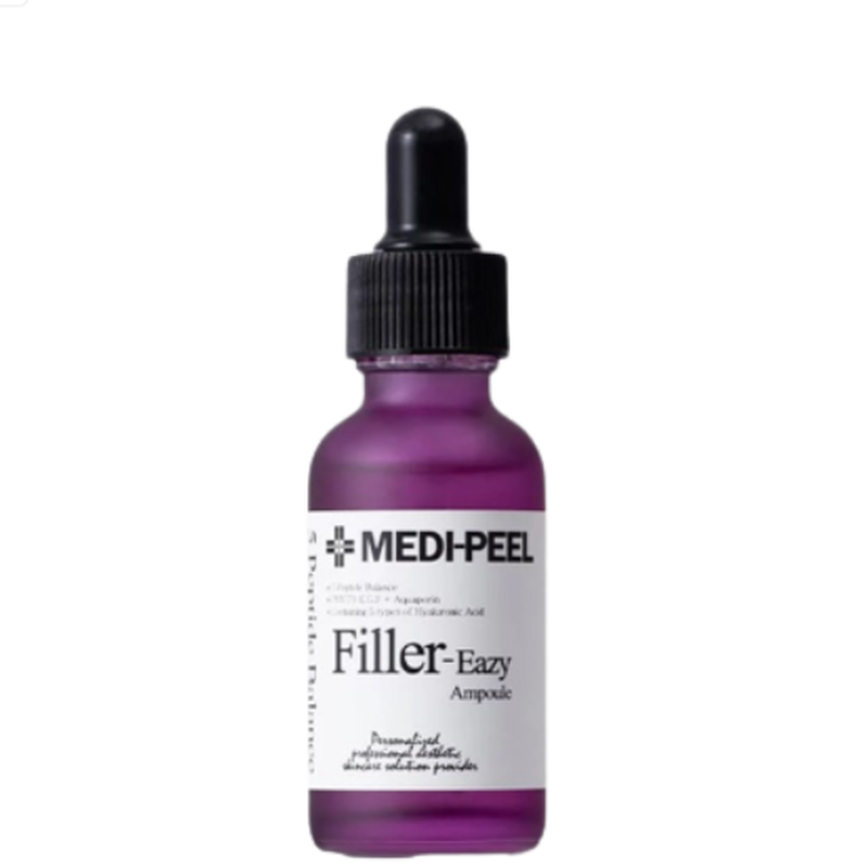 Ампула-филлер Medi-Peel Eazy Filler Ampoule: ✅ Восполняет недостаток упругости, делает кожу плотной и гладкой, сокращает морщины и препятствует появлению, замедляет процесс старения. ✅ Улучшает состояние кожи вокруг глаз, в области лба и носогубных складок, укрепляет изнутри. ✅ Предотвращает сухость и шелушение, укрепляет естественный защитный барьер и способствует удержанию влаги. ✅ Мягко отшелушивает роговой слой, выравнивает микрорельеф. Содержит пептидный комплекс Matrixyl®3000 – сочетание пептидов-матрикинов, которые запускают выработку собственного коллагена, тем самым разглаживают морщины, придают ровную текстуру, улучшают тон лица и замедляют старение. Формула богата пептидом меди (Copper Tripeptide-1), который не только оказывает антивозрастной эффект, повышая упругость и разглаживая, но и обеспечивает противовоспалительное действие, а также заживляет и поддерживает здоровье клеток. Аргирелин (Acetyl Hexapeptide-8) в составе обеспечивает ботуловидный эффект, расслабляя лицевые мышцы, пептид препятствует образованию мимических морщин и уменьшает глубину уже существующих, действуя миорелаксантом. Дополнительные действующие компоненты: EGF (Oligopeptide-32, Oligopeptide-29, Rice sh-Oligopeptide-1) стимулируют рост клеток, укрепляют, разглаживают и подтягивают кожу, повышают выработку коллагена и эластина. В составе крема содержится растительный эпидермальный фактор роста, извлеченный из риса. Пуллулан – полисахаридный полимер, обладает сильным антиоксидантным эффектом. Создает на коже неощутимый слой, удерживающий влагу, подтягивающий и разглаживающий. Замедляет процессы старения и укрепляет ткани, поворачивая коже гладкость и сияние. Глюконолактон (PHA-кислота) имеет большие молекулы, чем AHA-кислоты, за счет чего подходит для чувствительной кожи. Деликатно удаляет ороговевшие клетки, выравнивает микрорельеф и освещает пигментацию. RiFerm® – комплекс на основе сахаромицетов, интенсивно увлажняющий и уменьшающий видимость морщин, придавая эластичность и ровный рельеф. Blue Complex – растительный комплекс из лаванды, василька, ромашки, гиацинта, бораго и шалфея. Обеспечивает антиоксидантную защиту, увлажняет и питает, предотвращает сухость и ощущение стянутости, борется с шелушением. 5 видов гиалуроновой кислоты обладают способностью связывать влагу и образуют влагоудерживающий барьер на поверхности эпидермиса, за счет чего устраняют сухость и чувство стянутости, поддерживают эластичность и упругость. Экстракт плодов граната защищает от оксидативного стресса, смягчает, оказывает антивозрастное действие и помогает усвоению коллагена. Гидролизованные гликозаминогликаны – мукополисахариды, компоненты природного защитного барьера кожи. Восстанавливают повреждения, борются с сухостью и раздражением. ✅ Подходит для всех типов кожи. Способ применения: нанесите средство на тонизированное лицо и распределите по коже мягкими, массирующими движениями. Продолжайте уход. ✅ 30 мл.