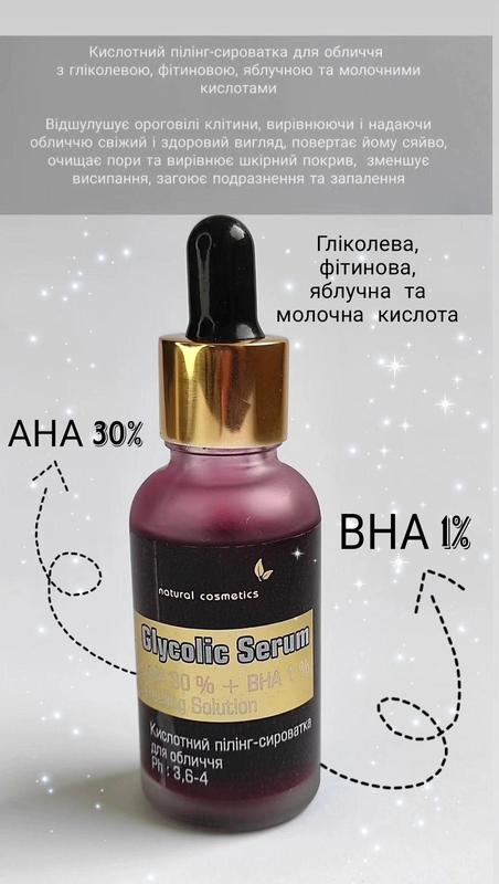Кислотный пилинг-сыворотка для лица Кожа лица требует регулярного и постепенного отшелушивания. Этот процесс помогает улучшить тон лица, устранить видимые недостатки кожи и усовершенствовать рельеф. Пилинг с гликолевой, фитиновой, яблочной и молочными кислотами - отыскает ороговевшие клетки, выравнивая и придавая лицу свежий и здоровый вид, возвращает ему сияние, очищает поры и выравнивает кожный покров. В основе средства содержится много активных ингредиентов: ▪️AHA 30% ▪️BHA 1% ▪️гликолевая, фитиновая, яблочная и молочные кислоты Способ применения: нанести пилинг на очищенную, сухую кожу лица и шеи. Избегать области вокруг глаз. Подержать 7-10 минут. Смыть большим количеством воды. Использовать 2 раза в неделю. Перед использованием рекомендуем протестировать средство на небольшом участке кожи. Избегайте попадания в глаза! Наносить пилинг только на сухую кожу. После применения средства используйте успокаивающий крем, а с утра нанесите солнцезащитный крем. Прекрасьте использование пилинга при возникновении раздражения. Храните в недоступном для детей месте. Объем : 30 мл Производитель : Украина
