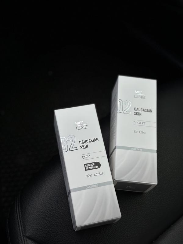 Me Line Caucasian Skin Day — Компоненти денної сироватки (фітинова, койєва і транексамова кислоти) забезпечують поступову депігментацію (освітлення пігментних плям), продовжуючи і посилюючи ефект від пілінгу. Глутатіон і біоміметичні пептиди забезпечують антиоксидантний захист і загальний antiage вплив на шкіру. А інноваційний пігмент Cameleon® White сприяє вирівнюванню тону шкіри; 02 Me Line Caucasian Skin Night — Головний компонент нічного крему — біоміметичний пептид Melanostatine®-5 у найвищій концентрації. Блокує утворення пігменту меланіну на самому першому етапі, повністю запобігаючи відновленню гіперпігментації в місці нанесення. Арбутин, резорцинол і ретинал забезпечують поступову депігментацію (освітлення існуючих пігментних плям), продовжуючи і посилюючи ефект від пілінгу;