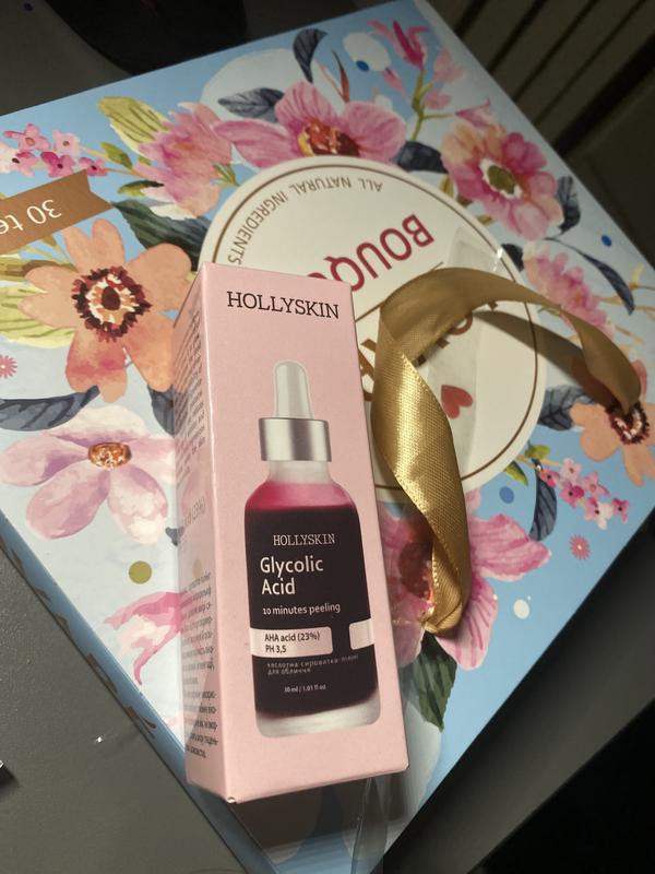 Трендова кислотна сироватка Hollyskin Glycolic Acid Кислотна сироватка-пілінг миттєво покращує колір і мікрорельєф обличчя, дозволяє шкірі сяяти. М'яко відлущує відмерлі клітини, зволожує й освіжає, зменшує видимість вікової і сезонної пігментації, усуває постакне. Тип шкіри: жирна, комбінована Без плівки НІ РАЗУ НЕ ВИКОРИСТОВУВАЛАСЬ.
