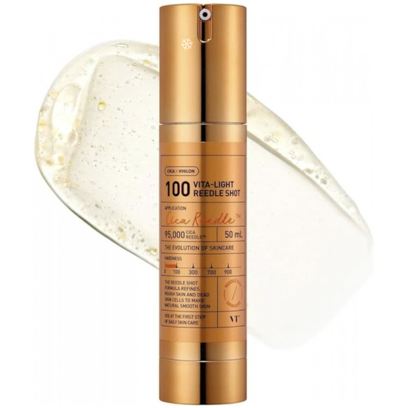 Код 2793 Серум-бустер с микроиглами и витамином C VT Cosmetics Vita-Light Reedle Shot 100 – это высокоэффективное средство, созданное для восстановления здорового сияния кожи, борьбы с пигментацией и увлажнения. Благодаря инновационной технологии спикул продукт способствует глубокому проникновению активных компонентов для максимального результата. VT Cosmetics Vita-Light Reedle Shot 100 – это идеальный выбор для тех, кто стремится увлажнить и восстановить кожу. Его легкая текстура быстро поглощается, обеспечивая коже свежесть и энергию, а также делает ее более сияющей. Этот продукт станет прекрасной частью вашей ежедневной рутины по уходу за кожей, даря ей здоровый и естественный вид. Ключевые ингредиенты: Витамин С – природный антиоксидант. Он действует на кожу как ингредиент против морщин, стимулирующий выработку коллагена. Обладает мягким отбеливающим эффектом, благодаря чему избавляет кожу от пигментных пятен и гиперпигментации. Защищает кожу от наружных радикалов, УФ-лучей и смога. Помогает бороться с акне и рубцами. Гиалуроновая кислота глубоко увлажняет и способствует эластичности кожи. Никотиновая кислота (витамин B3) – уменьшает пигментацию и стимулирует синтез коллагена. Витамин Е является одним из самых распространенных в уходе за кожей. Независимо от того, используется или наносится местно, он может помочь поддержать здоровье и внешний вид кожи, защищая ее от повреждения ультрафиолетом и, возможно, замедляя процесс старения. Ниацинамид (5%) естественно обновляет кожу и дает эффект против морщин. Благодаря своему действию обеспечивает выравнивание тона кожи, сужает поры, лечит небольшие следы от прыщей. Борется с темными пигментными пятнами, стимулирует выработку кожного сала, уменьшает покраснение и раздражение. Его свойства способствуют выработке коллагена и защищают кожу от УФ-лучей. Это универсальный компонент, подходящий для всех типов кожи. Увлажняет кожу, сохраняя ее матовой. MELAZERO®V2 – средство для осветления кожи, известное своей эффективностью в уменьшении гиперпигментации. Он работает с помощью уникального механизма под названием «меланофагия», помогающего расщеплять меланин на аминокислоты, тем самым осветляя кожу. Это средство получают из экстракта Arisaema Amurense и известно своими быстрыми результатами, часто демонстрирующими видимые эффекты в течение двух недель. Глутатион – мощный антиоксидант, улучшает упругость и тон кожи. CICA REEDLE™ – микроиглы, стимулирующие кожу, улучшая поглощение активных компонентов. Подходит для всех типов кожи, особенно для тусклой и склонной к неравномерному тону. Способ применения: очистите кожу от загрязнений и макияжа. Нанесите небольшое количество средства на чистую кожу, избегая зоны вокруг глаз. Осторожно массируйте лицо легкими круговыми движениями до полного впитывания средства. Используйте каждый день для достижения оптимальных результатов. В дневное время используйте солнцезащитное средство SPF50 PA++++. Чувство покалывания после нанесения является нормой и свидетельствует о действии микроигл. Предостережение: не сочетайте с кислотными пилингами, скрабами или продуктами с высоким содержанием кислот. Избегайте использования после дерматологических процедур, травмирующих кожу. 50 мл