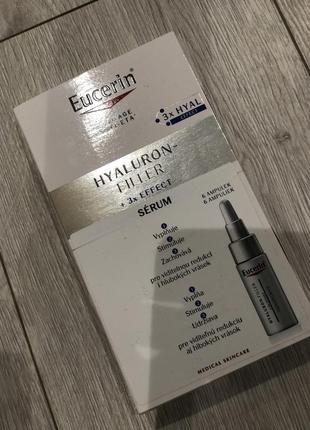 Концентрат уход для лица EUCERIN (Юцерина) Hyaluron-Filler (Гиалурон Филлер) для глубоких морщин в ампулах по 5 мл 6 шт Hyaluron-Filler против глубоких морщин, 6 х 5 мл. Гиалуроновая кислота вырабатывается организмом человека, но с возрастом этот процесс замедляется, вызывая появление морщин. Также свободные радикалы ускоряют старение кожи. Антивозрастная инновация. 3х ефект: Уменьшение морщин: Высокомолекулярная гиалуроновая кислота уменьшает выраженность и количество морщин в верхних слоях кожи, интенсивно увлажняя кожу. Низкомолекулярная гиалуроновая кислота (ее молекулы в 40 раз меньше*) проникает в глубокие слои эпидермиса и разглаживает даже глубокие морщины; Антиоксидантное действие: Сапонин стимулирует выработку собственной гиалуроновой кислоты и защищает кожу от свободных радикалов; Эноксолон уменьшает естественный распад гиалуроновой кислоты.