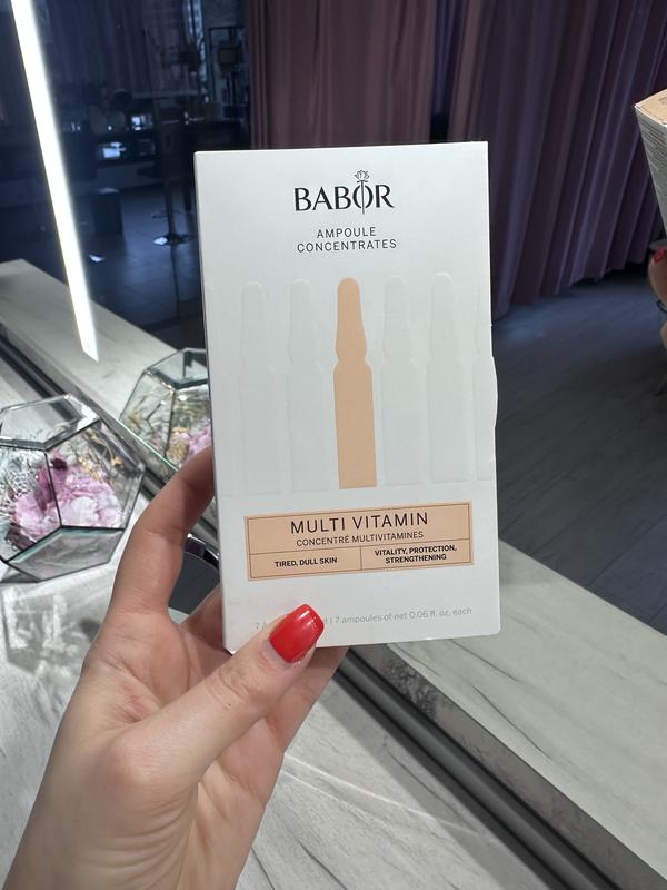 Ослаблена й утомлена шкіра потребує комплексного догляду. Про це подбає концентрована сироватка Babor Ampoule Concentrates Multi Vitamin для живлення і зволоження. Багата на вітаміни й антиоксиданти формула зміцнює шкірний бар’єр і додає тьмяній шкірі життєвих сил, яскравості й свіжості. Уже після першого нанесення обличчя стає чудово доглянутим і захищеним від зовнішніх впливів. Властивості: освітлює шкіру, надає їй свіжості й енергії зміцнює шкіру й захищає її від зовнішніх впливів інтенсивно живить і зміцнює захисний бар’єр шкіри вирівнює тон шкіри робить шкіру обличчя гладенькою і ніжною підходить для слабкої, втомленої та блідої шкіри олійно-перламутрова текстура