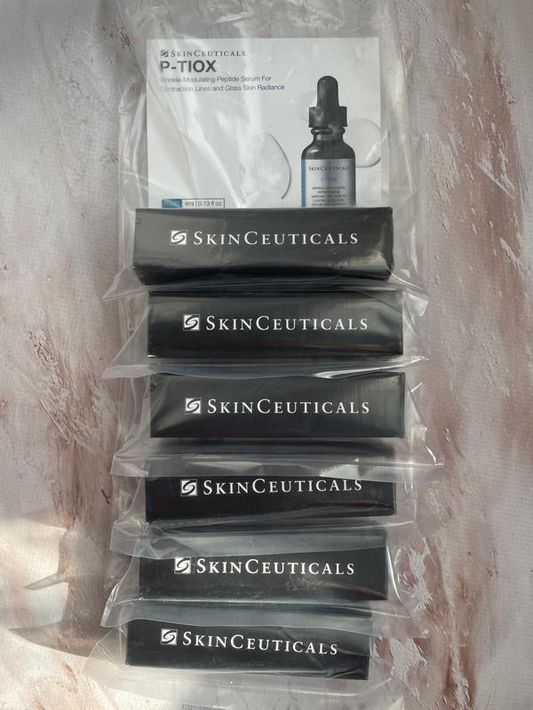 SkinCeuticals P-TIOX Anti-Wrinkle Peptide Serum 4ml. Революційна сироватка з пептидами для модуляції зморшок і скляної шкіри P-TIOX — це сироватка на основі пептидів, яка, як клінічно доведено, зменшує появу 9 типів мімічних зморшок і відкриває скляне сяйво шкіри. Натхненний ефектом ін’єкцій нейротоксину, P-TIOX містить запатентовану суміш передових пептидів, посилених синергічними активними речовинами (PHA, ніацинамід та екстракт ламінарію), щоб помітно зменшити зморшки, покращити текстуру та сяйво шкіри та доповнити результати професійних ін’єкцій. P-TIOX перевірено лікарями як доповнення до ін’єкцій нейротоксину та ефективний сам по собі для досягнення безголкової корекції зморшок без допомоги професійних ін’єкцій. Що таке нейротоксин: М'язова тканина полегшує рух, довільний чи мимовільний. Існує понад два десятки м’язів обличчя, які скорочуються, створюючи такі вирази, як усмішка, насуплені брови та рухи брів. З віком такі важливі структурні білки, як колаген і еластин, деградують і стають менш гнучкими. З часом поєднання руху м’язів і змін у структурі та цілісності шкіри може призвести до тонких і глибоких мімічних зморшок. Ін’єкції нейротоксину — це популярне лікування в офісі, яке використовується для лікування мімічних зморшок, спричинених скороченням м’язів. При введенні нейротоксини діють шляхом тимчасового блокування сигналів між м’язами та нервами, щоб обмежити скорочення, пом’якшити мімічні зморшки та запобігти утворенню нових зморшок. Результати цього лікування зазвичай спостерігаються через два тижні після лікування і тривають близько трьох місяців. Хоча ін’єкції нейротоксину є галузевим стандартом для зменшення мімічних зморшок, ін’єкції в деякі ділянки обличчя важко зробити. У поєднанні ін’єкції P-TIOX та нейротоксину діють синергетично, допомагаючи зменшити появу зморшок, впливаючи на ті ділянки обличчя, які нейротоксини не лікують самі по собі, і забезпечуючи швидкі та довгострокові результати.