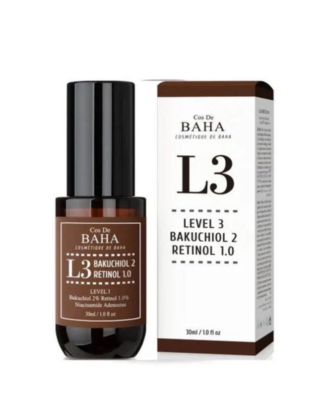 Cos De Baha L3 Bakuchiol 2 Retinol 1.0 Serum – сироватка з ретинолом та бакучіолом: допомагає оновити та омолодити шкіру; зменшує процеси старіння, гіперпігментації та проявів висипів; нежирна формула, легко вбирається; підійде всім типам шкіри. Ключові інгредієнти: бакучіол 2% – вважається рослинною альтернативою ретинолу; стимулює синтез колагену; ретинол 1% – бориться зі зморшками; екстракт лаванди – вирівнює тон, заспокоює. Обʼєм: 30 мл. Спосіб застосування: нанесіть на суху шкіру, після тонеру, у вечірній рутині. Для новачків рекомендуємо мʼякішу версію Cos De Baha Bakuchiol Retinol Serum L1.
