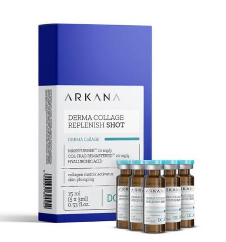 Описание: Водный «энергетический банк» на основе четырех разных форм гиалуроновой кислоты для немедленного увлажнения кожи! Увлажняющее средство ARKANA Dermal CollAGE Replenish Shot - это профессиональный косметический продукт, в составе которого используются два инновационных ингредиента - MARSturizer TM и Col-Frag TM. Первое вещество - это биотехнологический бактериальный фермент, контролирующий распределение воды и уровень кальция в коже. Он укрепляет ее барьерные функции, защищает кожу от обезвоживания и, таким образом, поддерживает ее регенерационные процессы. Col-Frag TM - имитирует фрагмент человеческого коллагена I типа, стимулирует фибробласты к биосинтезу коллагена - укрепляет и стабилизирует коллагеновые волокна. Современные активные ингредиенты в сочетании с разными формами гиалуроновой кислоты создают подтягивающую сетку для структурного лифтинга и эффективно заполняют морщины. Высококонцентрированное увлажняющее средство Dermal CollAGE Replenish Shot мгновенно восстанавливает уровень воды в коже. Его можно использовать в многоуровневом увлажнении и восстановлении коллагеновой матрицы DERMA CollAGE, созданном ARKANA. Эта профессиональная регидратационная процедура рекомендована для всех типов кожи, особенно для грубой, тусклой, вялой и усталой. Также он идеально дополняет профессиональные процедуры по борьбе со старением. Состав: Aqua, Glycerin, Propanediol, Isostearyl Isostearate, Polyglyceryl-6 Oleate, Polyglyceryl-6 Distearate, C10-18 Triglycerides, Cellulose Gum, Microcrystalline Cellulose, Hydrolyzed Sodium Hyaluronate, Sodium Hyaluronate Crosspolymer, Bacillus Ferment, Collagen Amino Acids, Jojoba Esters, Polyglyceryl-3 Beeswax, Cetyl Alcohol, Polyglyceryl-4 Caprate, Xanthan Gum, Pentylene Gycol, Raspberry Ketone, Benzyl Glycol, Phenoxyethanol, Ethylhexylglycerin, Tocopherol, Helianthus Annuus Seed Oil, Parfum. Способ применение: Мануально, легкими движениями вотрите средство в кожу. При помощи любого устройства или метода микроигловой терапии. Чтобы усилить стимуляцию выработки коллагена, мы рекомендуем использовать Dermal CollAGE Replenish Shot из Arkana C-Fusion GlowShot. Дизайн упаковки может меняться производителем