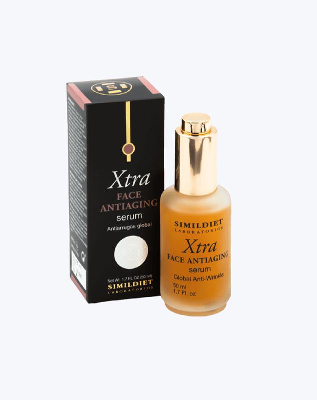 Simildiet Face Antiaging Serum Xtra — антивікова сироватка. Склад Гіалуронова кислота, екстракт водоростей Enteromorpha compressa, полінуклеотиди (ДНК/РНК), алантоїн, екстракт листя базиліка, екстракт плодів розторопші, екстракт смоли кротона лехлера («драконова кров»), біоміметичні пептиди (ацетид тетрапептид-5, пентапептид-18, пальмітоілтрипептид-1 і пальпітоіл тетрапептид-7). Дія Сприяє усуненню ознак старіння — інтенсивно зволожує шкіру і зменшує вираженість зморшок. Унікальний склад забезпечує потужний антиоксидантний захист клітин від пошкоджень, викликаних вільними радикалами і негативними факторами навколишнього середовища. Показання до застосування Профілактика та корекція вікових змін, Зневоднена і атонічна шкіра, Зволоження та пом'якшення шкіри. Застосування Вранці і ввечері нанесіть кілька крапель сироватки на ретельно очищену і знежирену шкіру обличчя, шиї і декольте легкими масажними рухами.