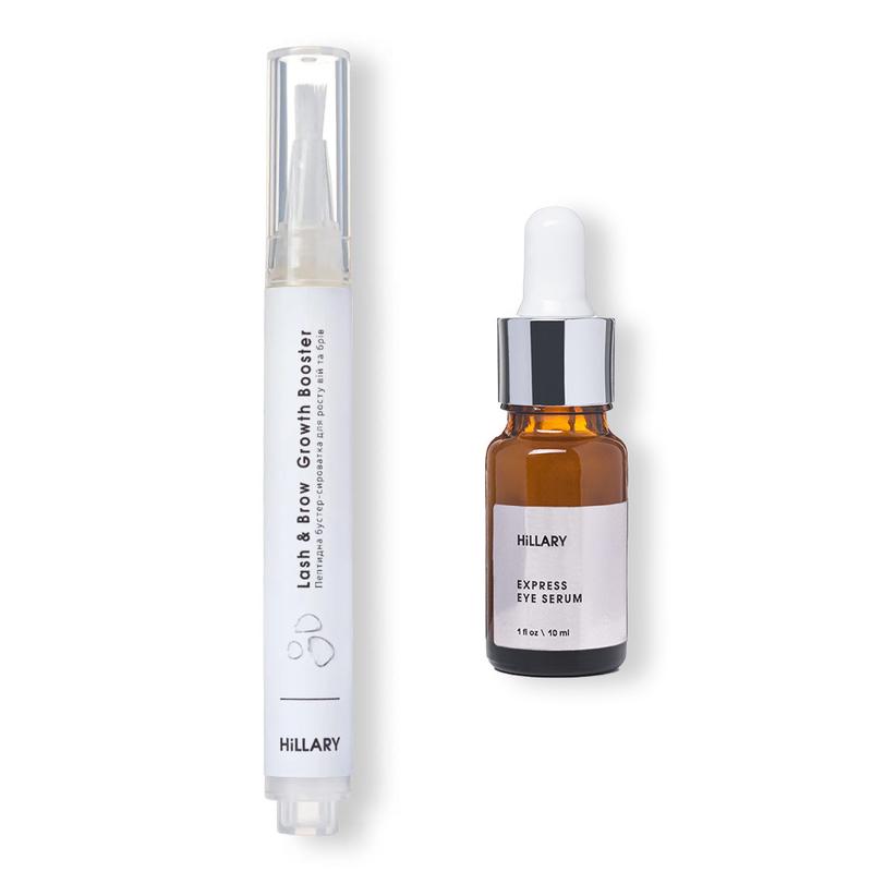 Густі, довгі вії і виразні брови -- мрія всіх дівчат. Інноваційна формула пептидної бустер-сироватки Hillary Lash & Brow Growth Booster з натуральними активними компонентами сприяє природному росту і зміцненню вій та брів, роблячи ваш погляд більш виразним. А високоефективні компоненти Експрес сироватки навколо очей Hillary Express Eye Serum допоможуть швидко позбавитися від темних кіл, мішків під очима і дрібних мімічних зморшок. Активний компонент пептидної бустер-сироватки -- натуральний активатор кератинового гена Мірістоіл пентапептид-17. Він сприяє природному росту і зміцненню вій та брів, відновлює структуру, робить сильнішими і подовжує їх життєвий цикл. Регулярне застосування сироватки стимулює активність волосяних фолікулів і сприяє отриманню прекрасних результатів уже через 4-6 тижнів: розкішні, густі, сильні вії та брови. Експрес сироватка навколо очей Hillary Express Eye Serum усуне сліди втоми і почервоніння, підтримає оптимальний гідробаланс епідермісу, підвищить пружність шкіри. Спільне використання косметичних продуктів дозволить домогтися найкращих результатів і зробить ваш погляд максимально виразним. Спосіб застосування сироватки для росту вій і брів Зніміть контактні лінзи, очистіть шкіру повік від макіяжу і видаліть залишки демакіяжного засобу. Перед нанесенням сироватки шкіра повік повинна бути чиста і суха. За допомогою аплікатора одним рухом нанесіть сироватку уздовж росту вій біля їх основи. Немає потреби наносити сироватку рясно або повторно. Не торкайтеся аплікатором очей. Курс застосування: 4-6 тижнів, щодня 1 раз в день. Рекомендується використовувати сироватку у вечірній час перед сном. Для досягнення максимального результату рекомендується використовувати сироватку 8-12 тижнів. Після курсу можна продовжувати застосування сироватки 1-2 рази в тиждень для підтримки результату, профілактики випадіння вій та захисту від несприятливих факторів. Спосіб застосування експрес сироватки навколо очей Невелику кількість сироватки нанесіть кінчиками пальців на добре очищену шкіру навколо очей. Застосовуйте один або два рази на день.