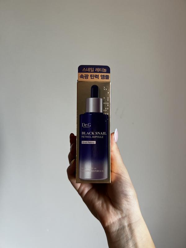 Сироватка Dr.G Black Snail Retinol Ampoule поєднує в собі потужний ретинол (0,1%) та муцин чорного равлика, що забезпечує інтенсивне омолодження шкіри. Вона сприяє зменшенню зморшок, покращенню еластичності та тону шкіри, а також вирівнює текстуру. Підходить для всіх типів шкіри, включаючи чутливу.