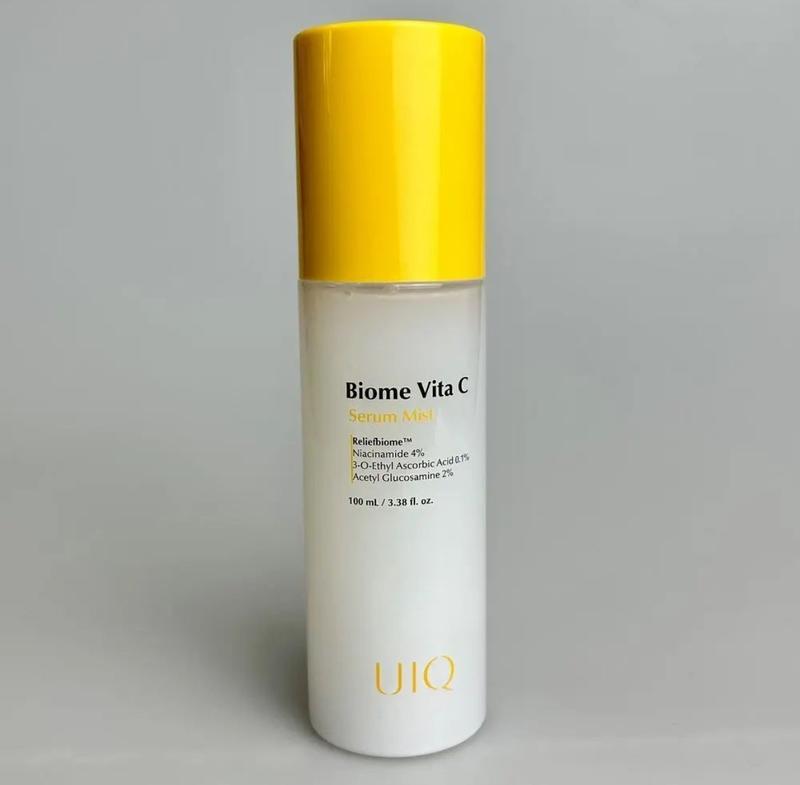 UIQ Biome Vita C Serum Mist — сироватка в форматі спрею з гелевою текстурою, що допомагає зволожити, заспокоїти та вирівняти тон шкіри, надаючи їй здорового сяйва. Має легку, гелеву текстуру, що розпиляється дрібними крапельками, не залишаючи відчуття липкості. Спрей пройшов тести на подразнення та безпечність для шкіри, схильної до реактивності та акне. Підходить для будь-якого типу шкіри, зокрема чутливої та проблемної. Основні компоненти: ReliefBiome™ (0,05%) — запатентований компонент, що базується на корисних бактеріях зі шкіри людини. Сприяє зменшенню чутливості шкіри, зміцненню шкірного бар’єра та оздоровленню шкіри. Ніацинамід (4%) та ацетилглюкозамін (2%) — допомагають покращити тон та текстуру шкіри, надаючи їй здорового сяйва. 3-О-етил аскорбінова кислота (0,1%) — некисла форма вітаміну C. Сприяє освітленню пігментних плям, не викликаючи подразнень. Гіалуронат натрію та гліцерин — забезпечують довготривале зволоження та підтримку барʼєра. Аденозин та алантоїн — допомагають заспокоїти шкіру та підтримувати її пружність. Застосування: Рівномірно розпиліть спрей-сироватку на обличчя з відстані приблизно 10-20 см. Можна використовувати для додаткового зволоження шкіри перед нанесенням макіяжу або просто протягом дня.
