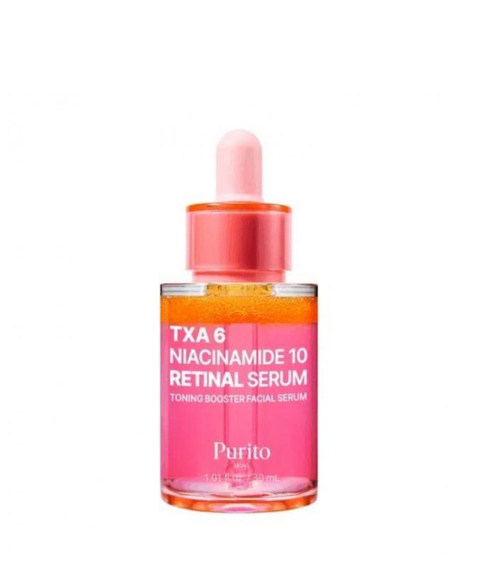 Purito Seoul TXA 6 Niacinamide 10 Retinal Serum — сироватка, призначена для ефективного освітлення пігментних плям. Має легку, водянисту текстуру з крапельками олії, швидко вбирається та не лишає липкості. Рекомендовано для шкіри з нерівним тоном та пігментними плямами. Сироватка пройшла тести на некомедогенність, гіпоалергенність та безпечність для реактивної шкіри. Не містить ароматизаторів та ефірних олій. Основні компоненти: Комплекс транексамої кислоти (6%) та ніацинаміду (10%) — сприяє помітному зменшенню гіперпігментації та покращенню тону шкіри, блокуючи меланін. Інкапсульований ретиналь — допомагає освітлити пігментні плями та вирівняти тон шкіри в 11 разів ефективніше, аніж ретинол. Ідебенон — має потужну антиоксидантну дію, що сприяє зменшенню окислювального стресу для шкіри. Аденозин — сприяє підтримці пружності шкіри і зменшенню дрібних зморшок. Застосування: Обережно струсіть флакон 3-5 разів, щоб розподілити крапельки олії. Рівномірно нанесіть на обличчя та легенько поплескайте для кращого вбирання.