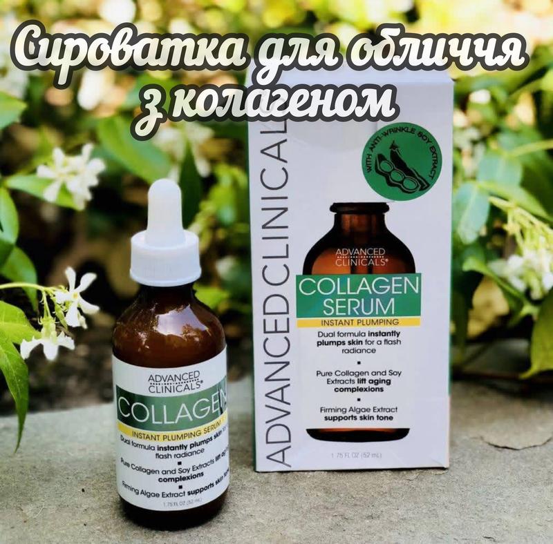 Сироватка для обличчя з колагеном (Collagen Serum) 52 мл це косметичний засіб для інтенсивного щоденного догляду за віковою шкірою, що надає ущільнюючу, зміцнюючу та підтягуючу дію. Функціональна дія: Дія сироватки для особи з колагеном (Collagen Serum) від Advanced Clinicals спрямована на стимулювання вироблення клітинами шкіри власного колагену та відновлення природних колагенових зв'язків. Застосування сироватки дозволяє в короткі терміни зміцнити шкіру обличчя, помітно підвищити її пружність, розгладити зморшки, підтягнути лицьові лінії та зберегти чітким овал обличчя, повернути шкірі молодість і красу. Додатково посилена потужним соєвим комплексом, що усуває провисання шкіри і підвищує її пружність, а також екстрактом водоростей ( зволожуючим, зміцнюючим і робить шкіру більш еластичною і вирівнює тон обличчя ). Допоміжними речовинами у складі сироватки також є сік алое, рослинні олії та екстракти, вітамін E, а також інші речовини, що надають на шкіру виражену омолоджуючу, розгладжуючу, підтягуючу та зміцнюючу дію. Крім цього, компоненти сироватки добре живлять і зволожують вікову шкіру, борються із сухістю, знімають почуття стягнутості та дискомфорту. Сироватка виготовлена за унікальною технологією, не містить парабенів, штучних ароматизаторів, барвників та інших шкідливих синтетичних речовин. Підходить для всіх типів шкіри, включаючи гіперчутливу. Застосування: Після очищення обличчя нанесіть сироватку на кінчики пальців для використання. Обережно нанесіть засіб на шкіру, особливу увагу приділяючи проблемним зонам. Зачекайте кілька хвилин, поки сироватка повністю вбереться. Потім обробіть шкіру зволожуючим засобом. Можна використовувати щодня вдень чи вночі.