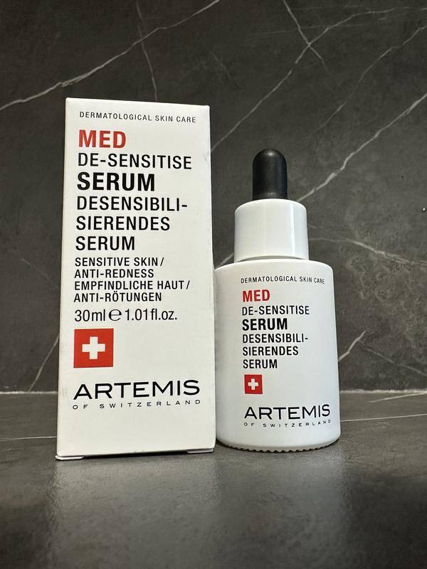 Сироватка ARTEMIS MED De-Sensitize - ідеальне рішення для чутливої шкіри, особливо для шкіри з куперозом або схильною до почервоніння та подразнення. Ця інтенсивно заспокійлива сироватка спеціально розроблена для зволоження шкіри, посилення її стійкості, забезпечуючи ефективний захист від впливу навколишнього середовища. Виробник Швейцарія. Лише з натуральних інгредієнтів. Не містить парабенів та спирт