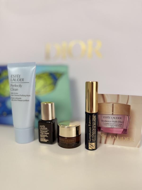 Доглядовий набір з топ засобами від Estée Lauder - Пінка для вмивання і очищувальна маска 2 в 1 30 мл -Estee Lauder Sumptuous Extreme Туш для вій 3 мл -Омолоджувальна сироватка для обличчя Estee Lauder Advanced Night Repair Synchronized Multi-Recovery Complex 7 мл -Мультифункціональний відновлювальний гель-крем для шкіри навколо очей Estee Lauder Advanced Night Repair Eye Supercharged Gel-Creme 5 мл -Денний ліфтинговий крем для сухої шкіри обличчя та шиї Estee Lauder Resilience Multi-Effect Face Creme SPF 15 Саше 1 мл -брендова косметичка