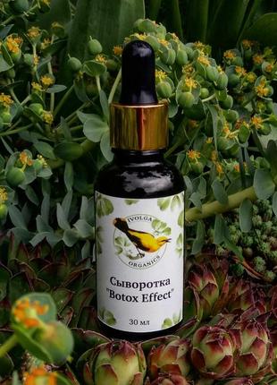 Активна зволожуюча сироватка проти мімічних зморшок миттєвої дії! Є природною неинъекционной альтернативою ботоксу, так як її дія базується на унікальному фитоминеральном комплексі, забезпечує глибоке проникнення і максимальну біоактивність. Сыворотка "Ботокс-эффект" поддерживает необходимый уровень гидратации кожи, а так же регулирует обменные процессы на клеточном уровне, обеспечивая кожу полноценным питанием. Воздействуя на особый мембранный белок, отвечающий за передачу нервных импульсов, способствует расслаблению мышц и уменьшению глубины мимических морщин. Не содержит жирного компонента, легко наносится и исчезает без следа, насыщая кожу живительными активными веществами. Рекомендуется применять под крем. Міорелаксуючу дію відчутно з перших днів застосування, результати помітні вже через 2 тижня регулярного застосування Botox-like (або Cova B Trox) - Аналог ботокса в натуральному виконанні. Розгладжує шкіру, усуває зморшки, зміцнює овал обличчя. Високоефективний рослинний компонент, у складі якого містяться комплексні сполуки магнію, полісахариди, екстракт водоростей. Розслаблює мускулатуру, має тривалу зволожуючу дію, сприяє розгладженню мімічних зморшок (ефект ботокса). Проникает в глубокие слои кожи, оказывая там свое благоприятное реабилитационное воздействие. Заметно омолаживает кожу, улучшает текстуру и цвет лица: Разглаживает мелкие и более глубокие морщины; Борется с мешками и темными кругами под глазами; Дает лифтинг-эффект, гладкость и упругость кожи.Усиливает защитные функции кожных покровов, снижает реакции на внешние раздражающие факторы на чувствительном уровне, обеспечивает выработку эндорфинов, оказывает значительный омолаживающий эффект, глубокий и продолжительный эффект лифтинга. Сыворотка "Ботокс-Эффект" позволяет в домашних условиях реализовать процедуру лицевого омолаживания, исключая необходимость посещения медицинских клиник и проведения дорогостоящих процедур! Состав: гидролат лаванды, гиалуроновая кислота низкомолекулярная, AlfaLip, Botox-like (или Cova B Trox), DNA gel, гидролизат протеинов фасоли, гидролизат протеинов зеленого горошка, гидролизат протеинов риса, Na-PCA, Д-пантенол Объем: 30 мл.