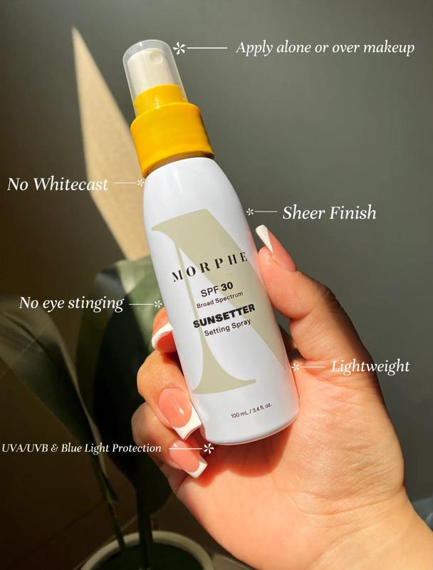 Фахівці з косметики Morphe розробили розумний спрей, який захищає шкіру від ультрафіолетових променів широкого спектру, а також зберігає макіяж. Morphe Sunsetter SPF 30 High-Protection Broad- Spectrum Setting Spray - це спрей для захисту шкіри, вдосконалення макіяжу, який закріплює та покращує макіяж за допомогою мікротонкого туману. Наповнений SPF30, він також захищає шкіру від сонячних променів UVA та UVB, синього світла та щоденних екологічних стресів, які можуть спричинити пошкодження шкіри. Він має прозорий фініш без білих слідів, не містить жиру та не комедогенний. Спосіб застосування: Рясно розпиліть легкий туман на обличчя за 15 хвилин до виходу на сонце та повторно нанесіть протягом дня, щоб зберегти захист SPF 30 Термін придатності: до 03.2026р