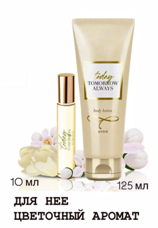 Жіночий парфумний міні набір TODAY Avon Набір містить: • Парфумна вода | 10 мл | • Парфумований лосьйон для тіла | 125 мл | TODAY tomorrow Always це вишукана і витончена композиція, в якій весняна легкість гібіскуса переплітається з розкішною терпкістю мускусу, а романтичний акорд сирійського ваточника хвилює так само як перший погляд. Це аромат твого кохання! ТИП АРОМАТА: Квітковий Країна Виробник: Польща