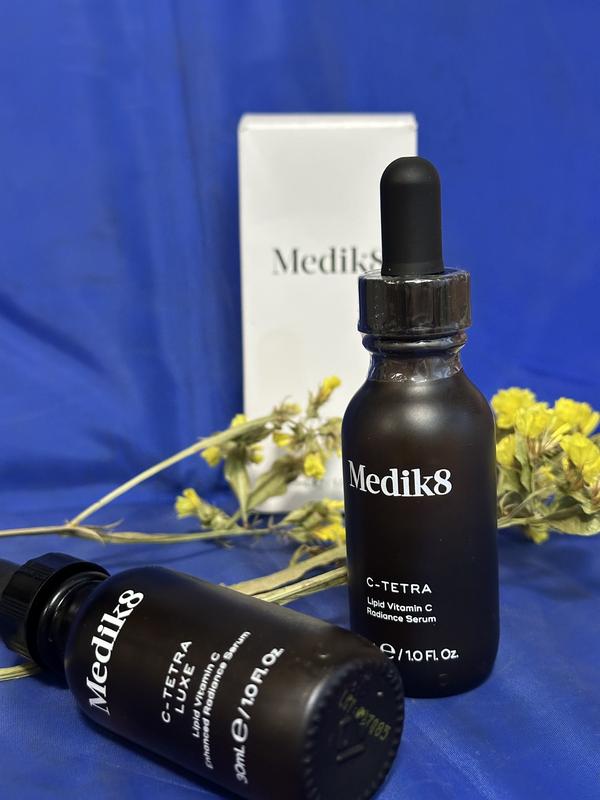 антиоксидантні сироватки з ліпідним вітаміном та інші засоби професійного догляду за обличчям 1. Сироватка С Medik8 C-Tetra (нова)2400 грн 2.СироваткаC-Tetra Luxe(відкрита)2600 грн 3. Нічний крем-сироватка з ретиналем Medik8 Crystal Retinal 10 5200 грн 4. крем для шкіри навколо очей Medik8 Crystal Retinal Ceramide Eye 3. 2500 грн. 5. омолоджуючий крем, що активує молодість, Medik8 r-Retinoate Youth Activating Cream Day & Night. 6200 грн Сонце, оксидативний стрес і забруднене довкілля часто призводять до в’ялості шкіри, сухості та появи пігментації. Втрачається пружність, обличчя виглядає тьмяним, а ознаки передчасного старіння стають більш помітнішими. З метою профілактики появи подібних недоліків або боротьби з наявними фахівці бренда Medik8 створили C-Tetra Vitamin C Antioxidant Serum. Ця легка сироватка з вітаміном C відновлює природну життєву енергію епідермісу, підвищує його захисні властивості, активує обмінні процеси. Її оксамитова консистенція швидко вбирається, наповнює шкіру вологою, вирівнює тон і оберігає від агресивних факторів навколишнього середовища. Особливості C-Tetra Vitamin C Antioxidant Serum від Medik8: - забезпечує активний антиоксидантний захист; - чинить опір вільним радикалам і наслідкам оксидативного стресу; - стимулює регенерацію тканин і синтез колагену; - сприяє підвищенню еластичності та пружності шкіри; - насичує її вологою й поживними мікроелементами; - справляється із освітленням пігментації, вирівнюванням тону; - запобігає повторній появі тьмяності, інших проявів знебарвлення; - стане в пригоді як профілактика передчасного старіння епідермісу; - робить його більш пружним, еластичним, сяйливим; - легка консистенція швидко вбирається без липкості, жирності; - підходить для щоденного догляду як основа під макіяж.