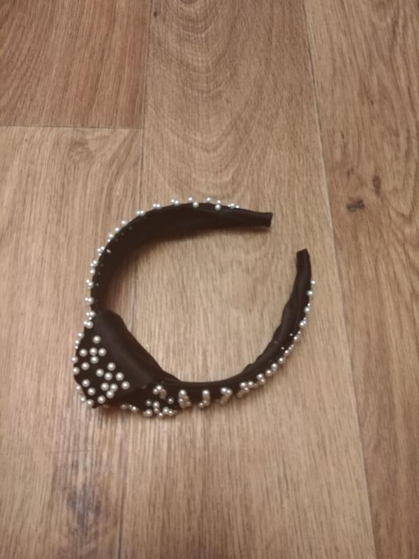 Новий, чорний, атласна тканина, з дрібненькими бусінками. Максимальна ширина 6см Обруч може підійти на вік 5-10років Довж 36см Ширина в середині 14см +розтягується