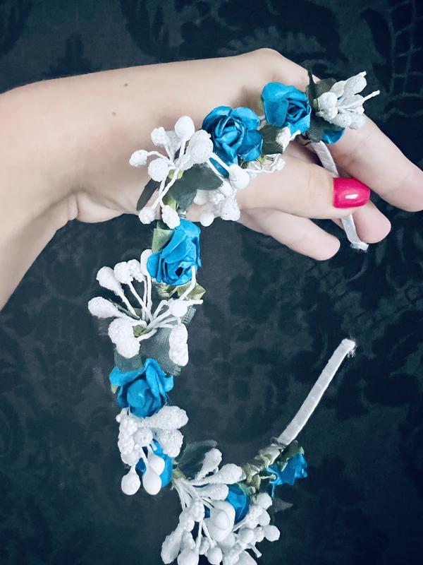 Вишуканий обруч в білих та голубиз тонах з трояндою