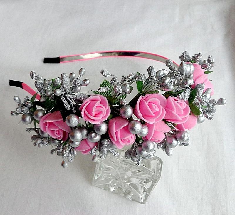 Обруч розовый для волос с цветами ручной работы" розовый фламинго"