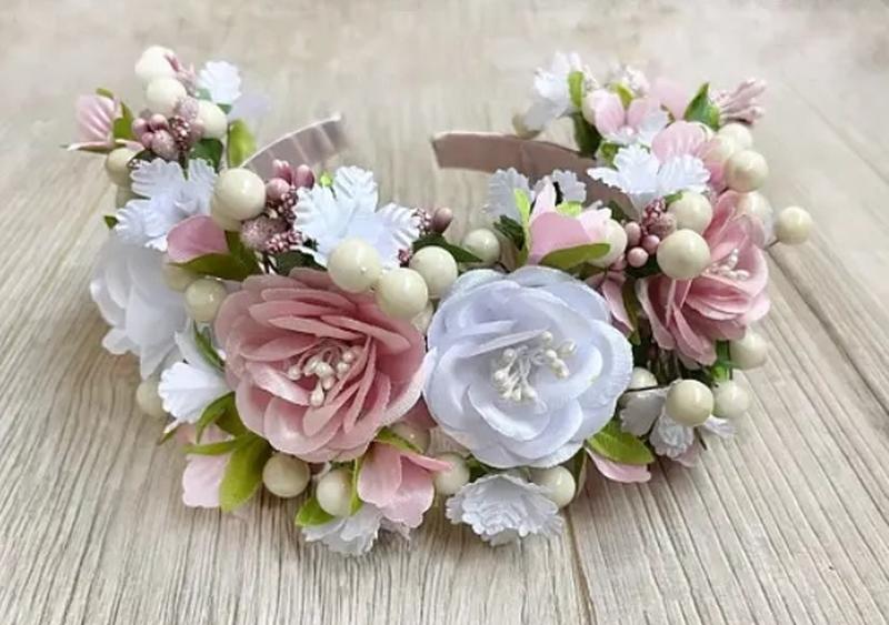 Обруч для волос ручная работа, выполненный из искусственных цветов, тычинок и флористичных деталей. Подходит для детей и для взрослых.