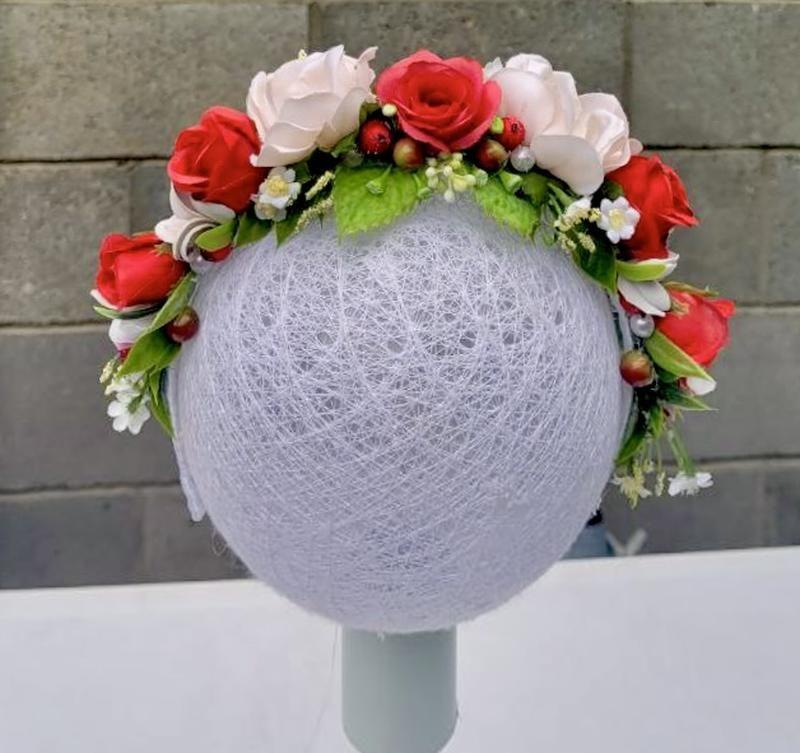 Віночок-обруч двосторонній з білих й червоних квітів та зелені.🌺🫶🏼Український дівочий вінок то не просто прикраса, а сильний оберіг від зурочення та нечистої сили👻 Дополнительные характеристики: Цвет: Алый Цвет: Белый Цвет: Зелёный