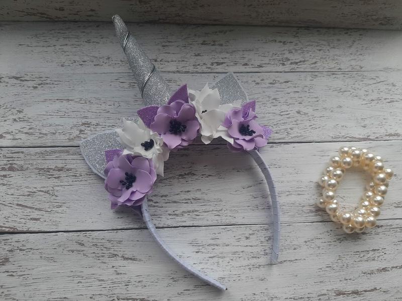 Ободок единорог , сделан из фоамирана и фетра, и украшен цветами. Основа - обруч пластиковый, обтянут репсовой лентой. Высота рога 14см.