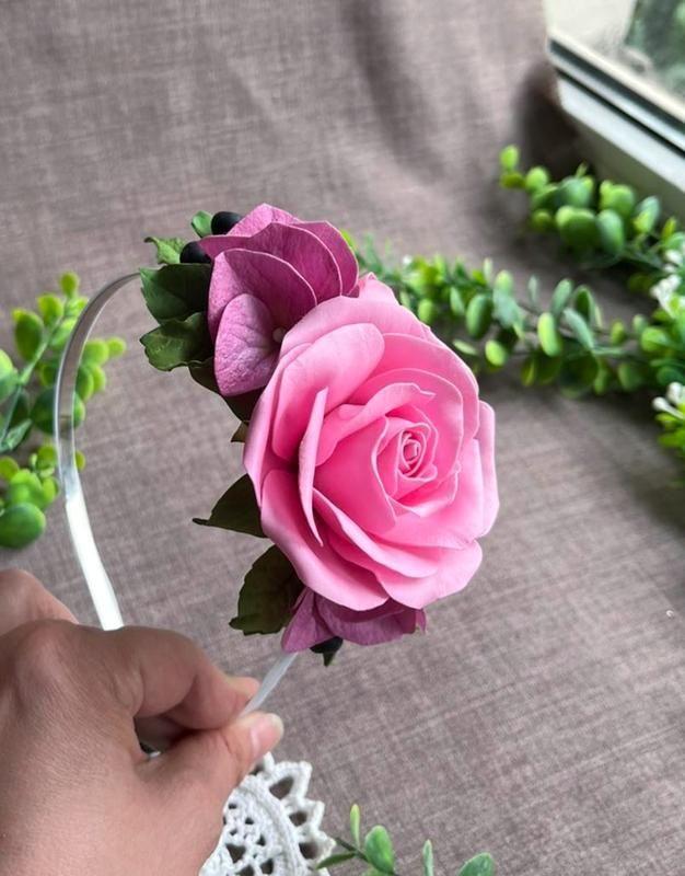 Красивий обруч для дівчинки з трояндою, доповнений гортензією і ягодами чорниці. Квіти зроблено із фоамірану.