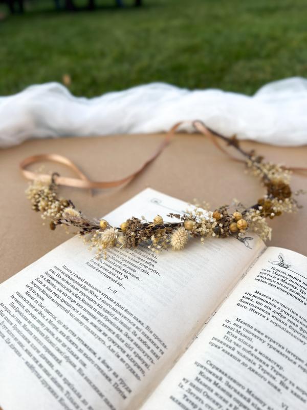 Сольский венок в стиле бохо и рустик из сухоцвета и стабилизированных цветов, натуральный...
