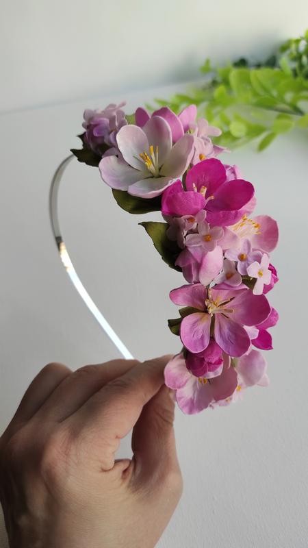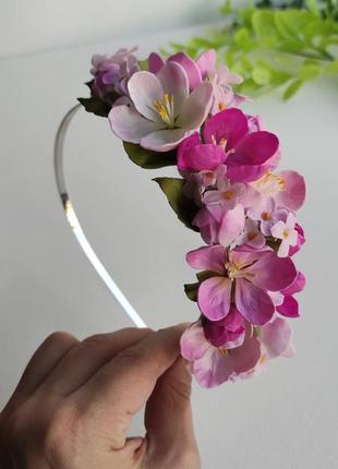 весенний яркий обруч с цветами яблони. все цветы и листочки из фоамирана, тонированные масляной пастелью. очень легкий