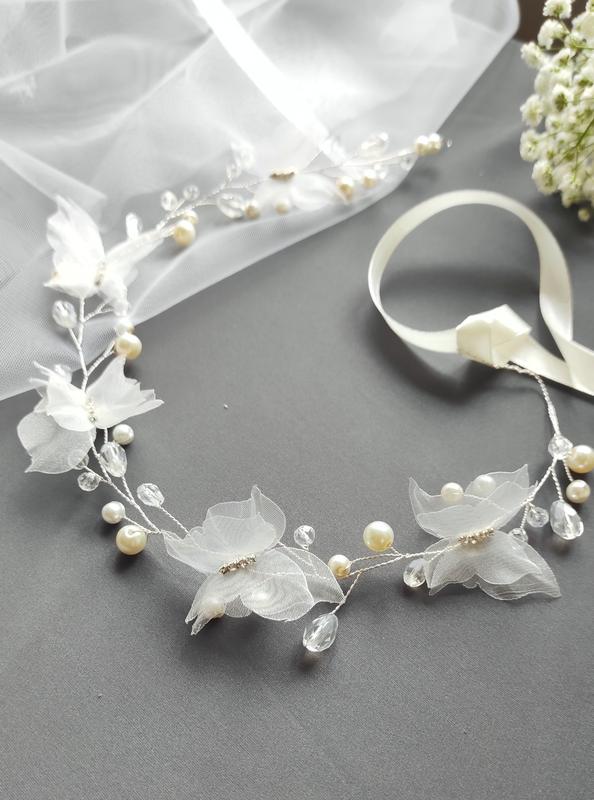 Бабочки прекрасно дополняют жемчужины и кристаллы, создавая волшебный образ. Я использовала молочную органзу для бабочек – она придает им нежную полупрозрачность, благодаря чему венчик выглядит легким и воздушным. длина венчика 43-44 см, жемчужины под стекло молочного цвета и хрустальные бусины сложит под заказ, оплата на счет ФОП, после платы нет