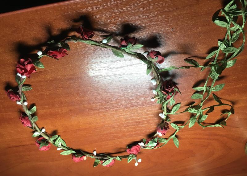 Віночок відповідає фото, діаметр- 18 см, листочки- шовковиста стрічка, може слугувати елементом костюму чи інтер"єру