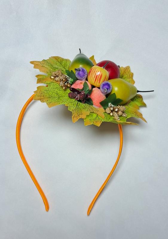обруч металлический в атласе. Листочки текстильные,фрукты и веточки. Есть другие венчики с яблочками,грушками,ягодками.