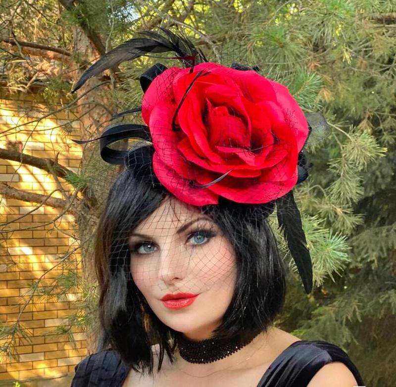 Обруч, декорированный большой красной розой, бархатными лентами, перьями и вуалью, подойдёт для фотосессии, девичника, тематических вечеринок и тп. Обруч дополнительно фиксируется с помощью резинки. Диаметр розы - 20 см.