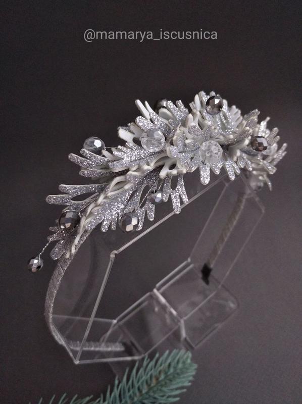 новогодний обруч с фантазийными веточками елочки и хрусталиками. выглядит как заснеженные веточки ложатся венчиком по головке. идеально к блестящему платью. обруч возможен в зеленом цвете. легкий. двусторонний. авторский