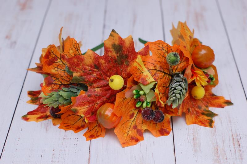 Яркий осенний ободок для волос, в котором собраны все краски осени, подойдет для тематических мероприятий, концертных выступлений, детского утренника в садике или школе. Ободок декорирован листьями, тыквами, хмелем, ягодами и тычинками Все элементы надежно закреплены на металлическом ободке универсального размера.