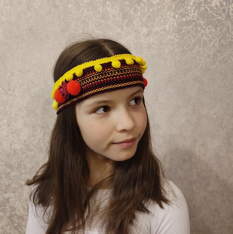 Чільце прикраса на голову, виготовлена з помпонами,крайки та фабричних квітів. чудова прикраса до традиційного українського вишитого одягу. Довжина регулюється . В наявності є великий вибір інших прикрас ручної роботи різних стилів та кольорів.