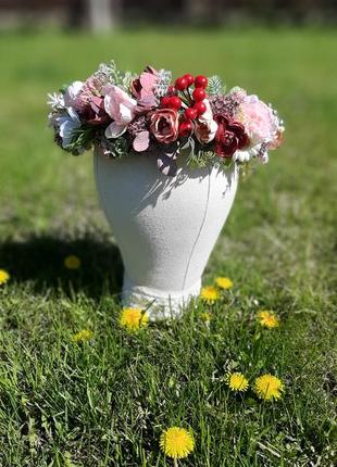 Многим полюбивший нежнейший веночек. На голове сидит стильно, нежно, ложится по форме головы, сзади регулируется лентами.